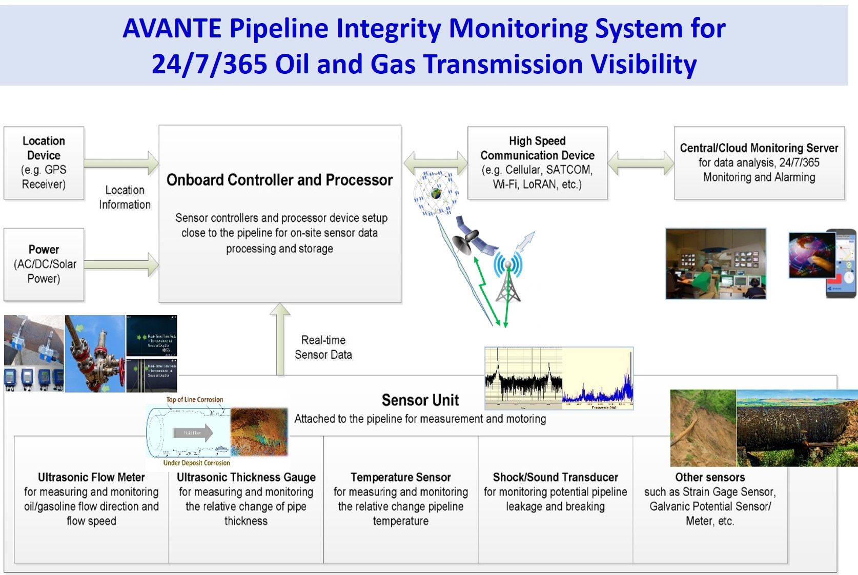 AVANTE Integrated Pipeline Integrity Monitoring System when deployed in the oil and gas up, mid and down stream pipeline choke points can provide end-to-end supply chain safety and Security management