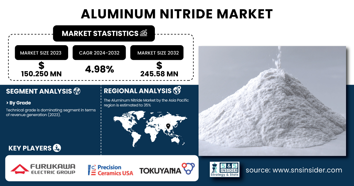 Aluminum Nitride Market Size was valued at USD 150.25 Million in 2023 and is expected to reach USD 245.58 Million by 2032, growing at a CAGR of 4.98% over the forecast period of 2024-2032.